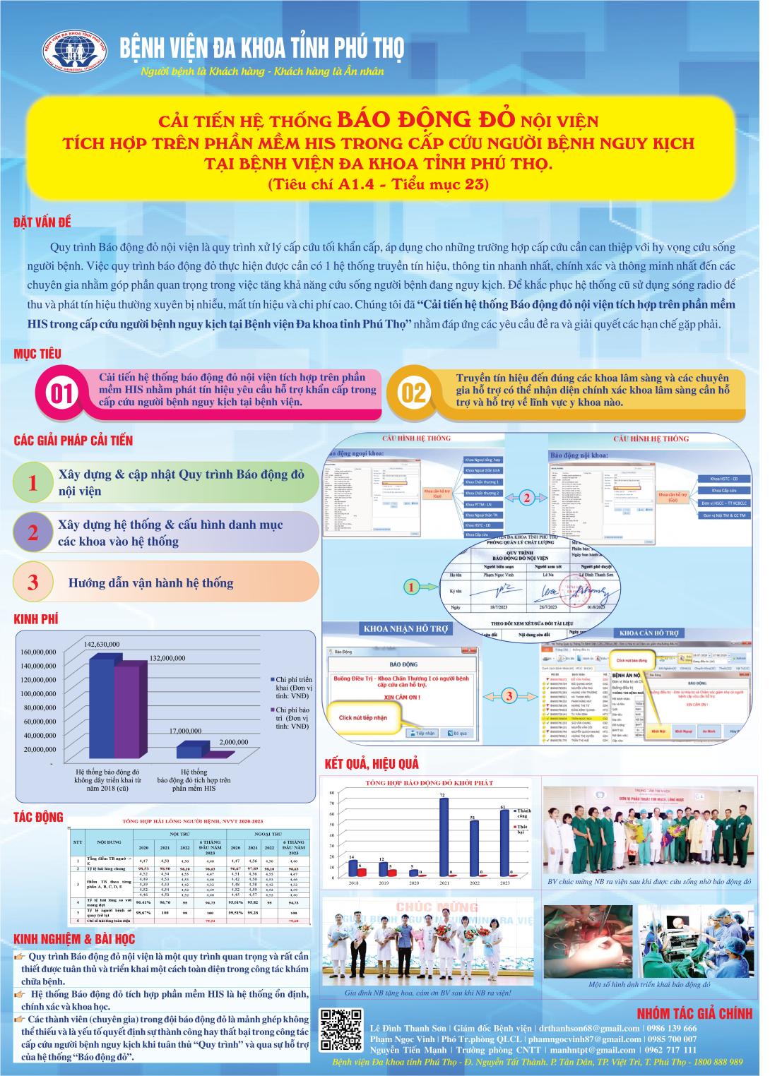 - Quy trình Báo động đỏ nội viện là quy trình xử lý cấp cứu tối khẩn cấp, áp dụng cho những trường hợp cấp cứu cần can thiệp với hy vọng cứu sống người bệnh. Việc quy trình báo động đỏ thực hiện được cần có 1 hệ thống truyền tín hiệu, thông tin nhanh nhất, chính xác và thông minh nhất đến các chuyên gia nhằm góp phần quan trọng trong việc tăng khả năng cứu sống người bệnh đang nguy kịch. Để khắc phục hệ thống cũ sử dụng sóng radio để thu và phát tín hiệu thường xuyên bị nhiễu, mất tín hiệu và chi phí cao. Chúng tôi đã “Cải tiến hệ thống Báo động đỏ nội viện tích hợp trên phần mềm HIS trong cấp cứu người bệnh nguy kịch tại Bệnh viện Đa khoa tỉnh Phú Thọ” nhằm đáp ứng các yêu cầu đề ra và giải quyết các hạn chế gặp phải.