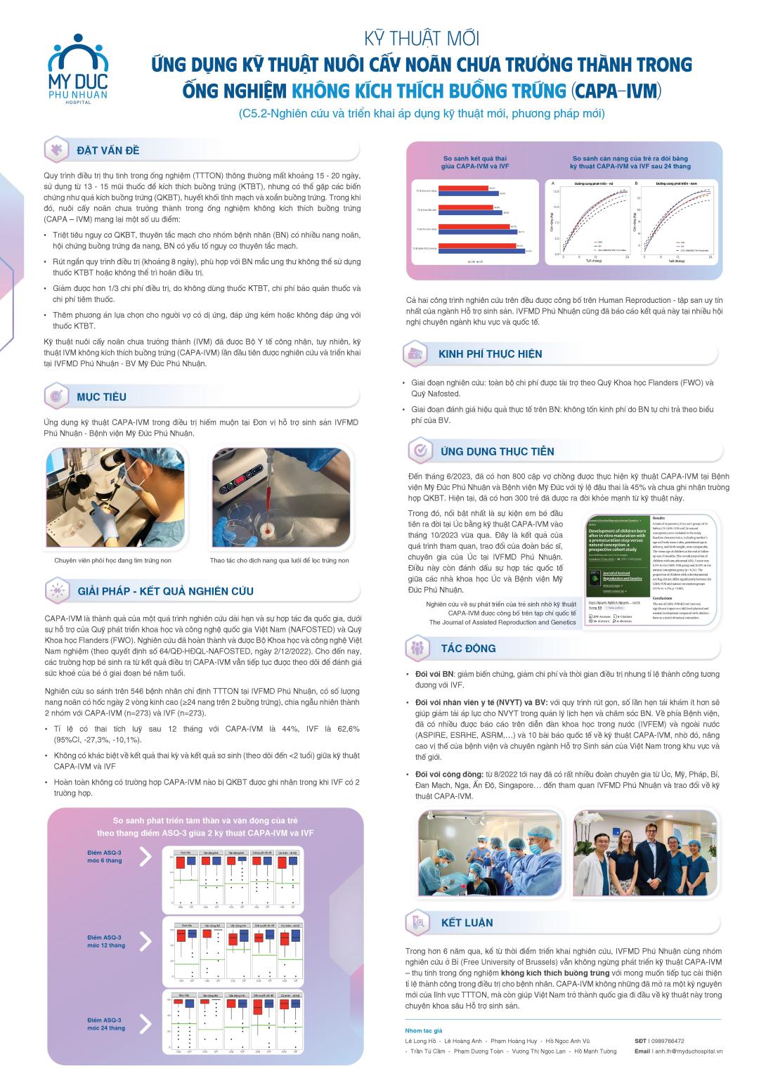 - Trong hơn 6 năm qua, kể từ thời điểm triển khai nghiên cứu, IVFMD Phú Nhuận cùng nhóm nghiên cứu ở Bỉ (Free University of Brussels) vẫn không ngừng phát triển kỹ thuật CAPA-IVM — thụ tinh trong ống nghiệm không kích thích buồng trúng với mong muốn tiếp tục cải thiện tỉ lệ thành công trong điều trị cho bệnh nhân. CAPA-IVM không những đã mở ra một kỷ nguyên mới của lĩnh vực TTTON, mà còn giúp Việt Nam trở thành quốc gia đi đầu về kỹ thuật này trong chuyên khoa sâu Hỗ trợ sinh sản.