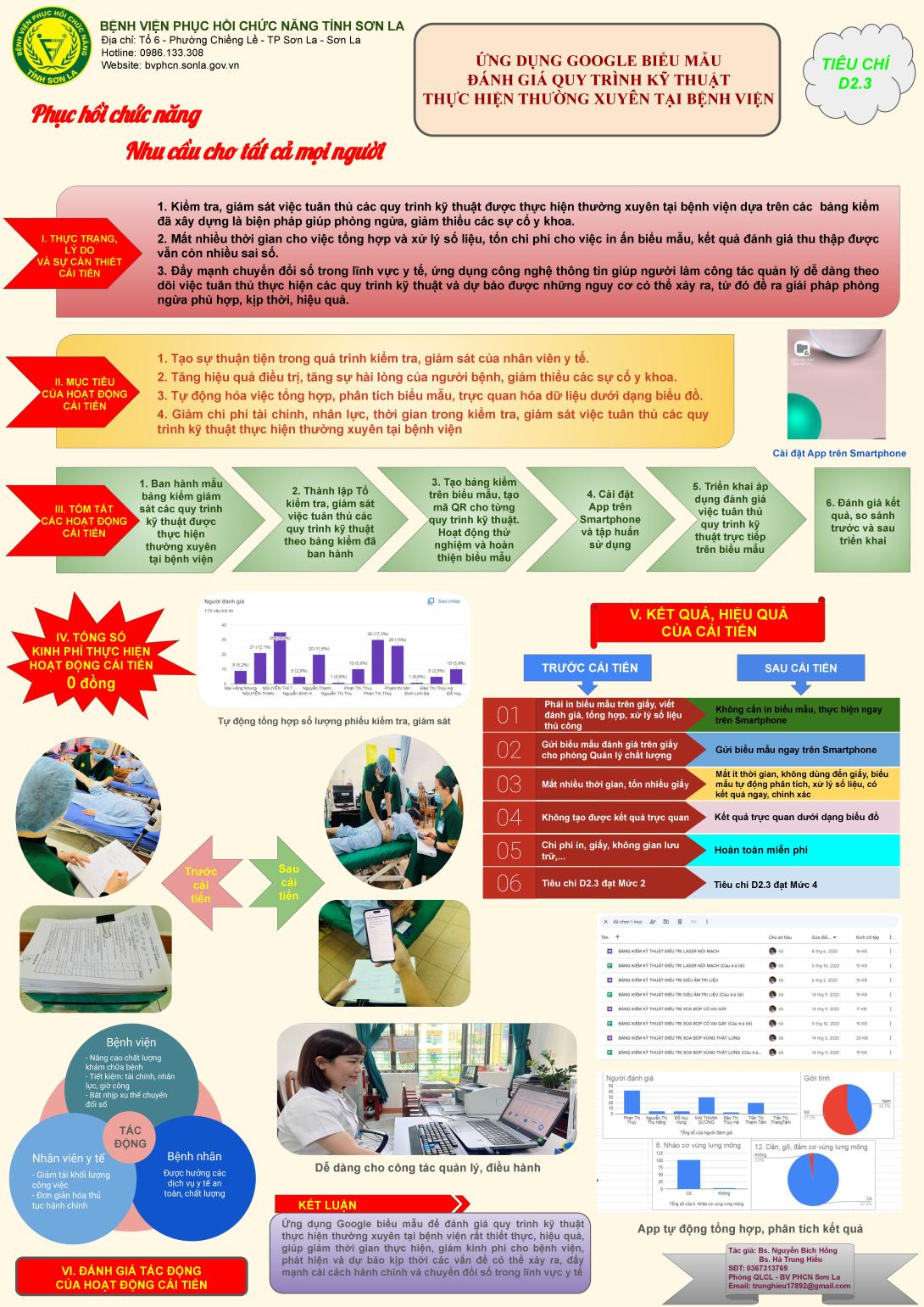 - Ứng dụng Google biểu mẫu để đánh giá quy trình kỹ thuật thực hiện thường xuyên tại bệnh viện rất thiết thực, hiệu quả, giúp giảm thời gian thực hiện, giảm kinh phí cho bệnh viện, phát hiện và dự báo kịp thời các vấn đề có thể xảy ra, đẩy mạnh cải cách hành chính và chuyển đổi số trong lĩnh vực y tế.