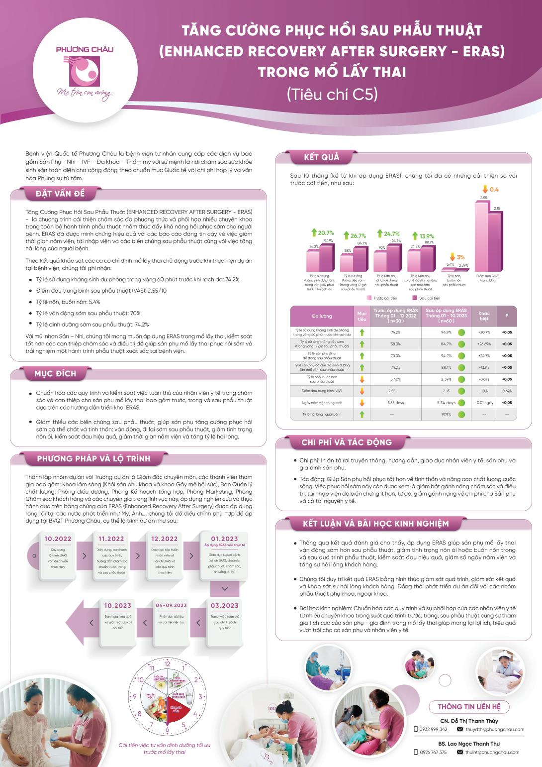 - Thông qua kết quả đánh giá cho thấy, áp dụng ERAS giúp sản phụ mổ lấy thai vận động sớm hơn sau phẫu thuật, giảm tình trạng nôn ói hoặc buồn nôn trong và sau quá trình phẫu thuật, kiểm soát đau hiệu quả, giảm số ngày nằm viện và tăng sự hài lòng khách hàng.