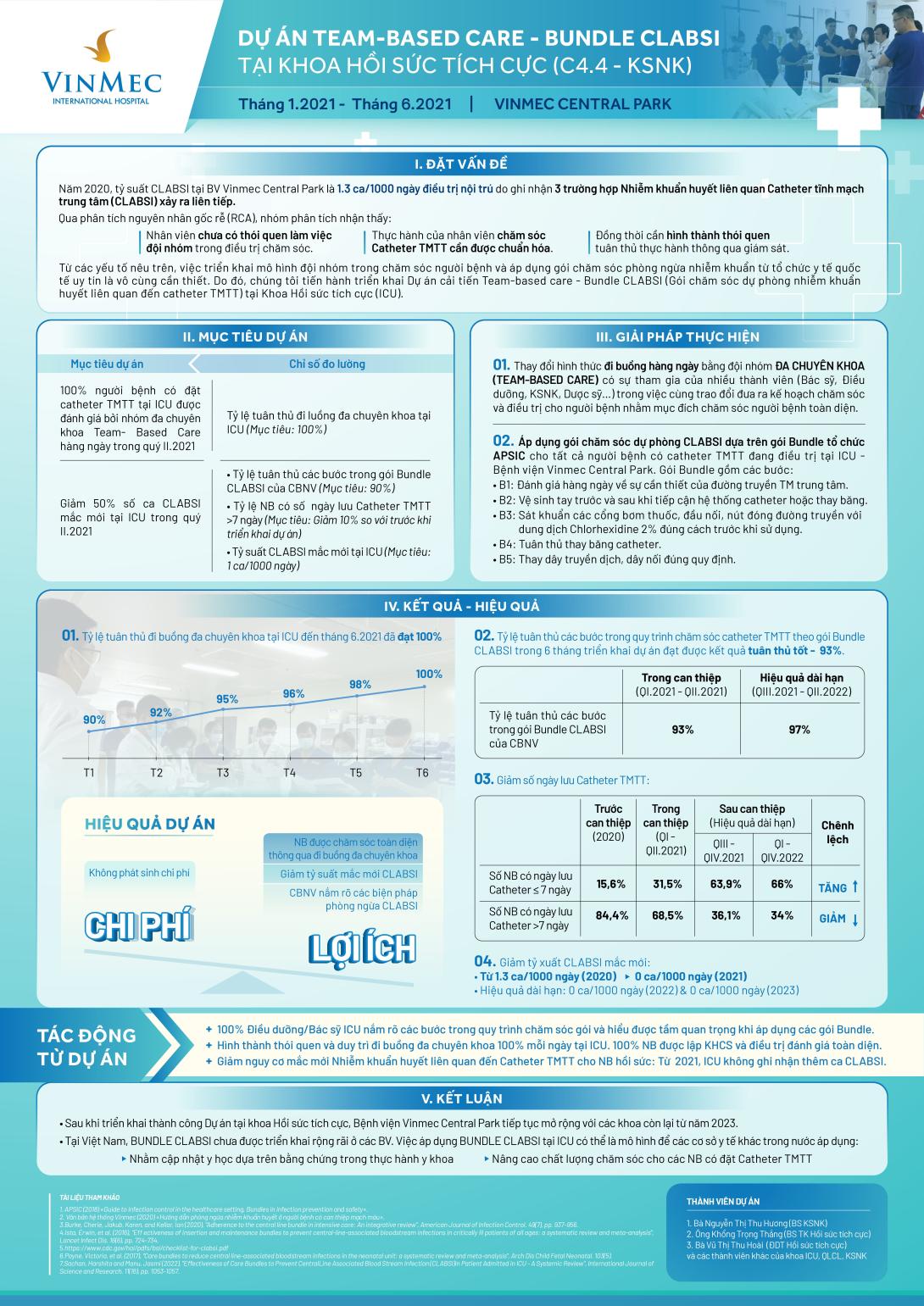 - Từ các yếu tố nêu trên, việc triển khai mô hình đội nhóm trong chăm sóc người bệnh và áp dụng gói chăm sóc phòng ngừa nhiễm khuẩn từ tổ chức y tế quốc tế uy tín là vô cùng cần thiết. Do đó, chúng tôi tiến hành triển khai Dự án cải tiến Team-based care - Bundle CLABSI (Gói chăm sóc dự phòng nhiễm khuẩn huyết liên quan đến catheter TMTT) tại Khoa Hồi sức tích cực (ICU).
