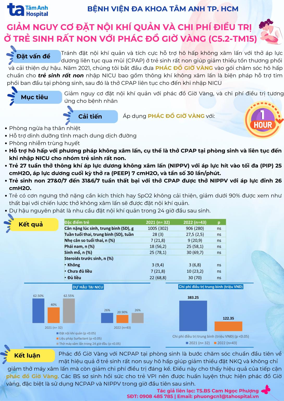 - Tránh đặt nội khí quản và tích cực hỗ trợ hô hấp không xâm lấn với thở áp lực dương liên tục qua mũi (CPAP) ở trẻ sinh rất non giúp giảm thiểu tốn thương phổi và cải thiện dự hậu. Năm 2021, chúng tôi bắt đầu đưa PHÁC ĐỒ GIỜ VÀNG vào gói chăm sóc hô hấp chuẩn cho trẻ sinh rất non nhập NICU bao gồm thông khí không xâm lấn là biện pháp hỗ trợ tim phổi ban đầu tại phòng sinh, sau đó là thở CPAP liên tục cho đến khi nhập NICU.