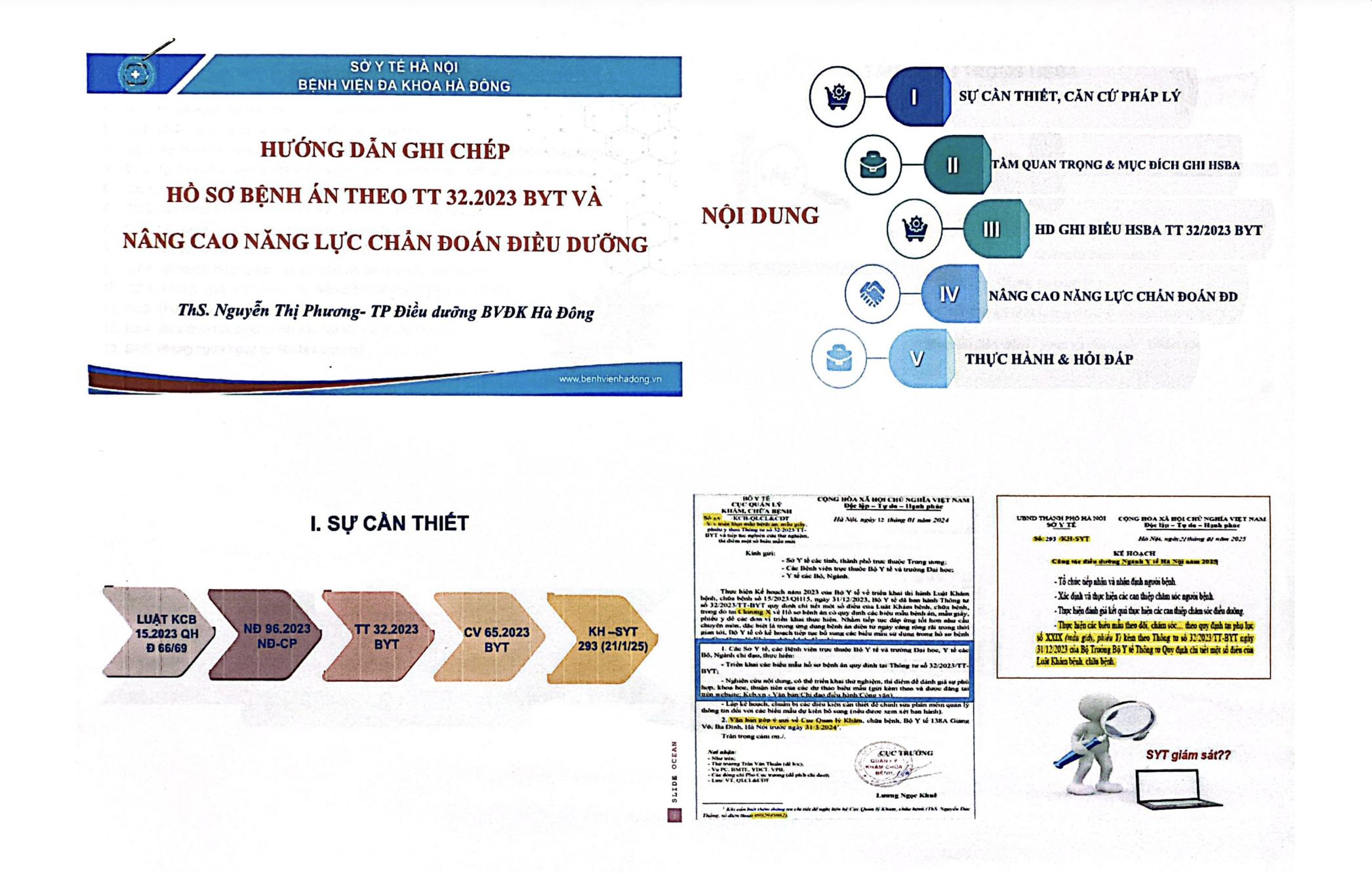 Tài liệu bài giảng đào tạo nội bộ do ThS. Nguyễn Thị Phượng – Trưởng phòng Điều dưỡng, Bệnh viện Đa khoa Hà Đông biên soạn, nhằm hướng dẫn thực hành ghi chép hồ sơ bệnh án (HSBA) theo quy định mới nhất tại Thông tư 32/2023/TT-BYT.