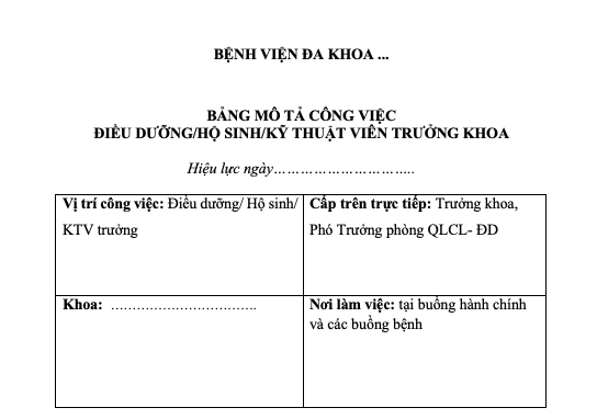 Tài liệu “Bản mô tả công việc Điều dưỡng/Hộ sinh/Kỹ thuật viên trưởng khoa” được xây dựng nhằm hỗ trợ các bệnh viện tham khảo trong quá trình hoàn thiện hệ thống mô tả công việc theo vị trí việc làm. Nội dung mô tả bao gồm chức năng, nhiệm vụ, quyền hạn, mối quan hệ công tác và yêu cầu năng lực đối với chức danh quản lý điều dưỡng cấp khoa, giúp chuẩn hóa và nâng cao chất lượng hoạt động chăm sóc người bệnh.