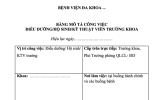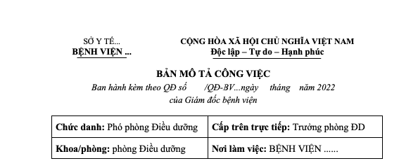 Tài liệu chỉ mang tính chất tham khảo. Mỗi bệnh viện cần xây dựng, chỉnh sửa và phê duyệt bản mô tả công việc phù hợp với thực tế hoạt động, cơ cấu tổ chức, quy mô và quy định nội bộ của bệnh viện mình, bảo đảm tuân thủ các văn bản pháp quy hiện hành của Bộ Y tế.