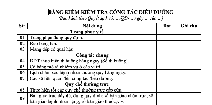 Tài liệu chỉ mang tính chất tham khảo. Mỗi bệnh viện cần xây dựng, điều chỉnh và ban hành mẫu bảng kiểm phù hợp với quy định, cơ cấu tổ chức và thực tế hoạt động của bệnh viện mình, đảm bảo đáp ứng yêu cầu quản lý chất lượng và cải tiến liên tục trong chăm sóc người bệnh.