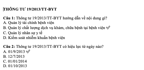 Tài liệu “Bộ câu hỏi trắc nghiệm về Thông tư 19/2013/TT-BYT” là một công cụ học tập rất phù hợp cho các khóa tập huấn về quản lý chất lượng, giúp nhân viên y tế nắm chắc: