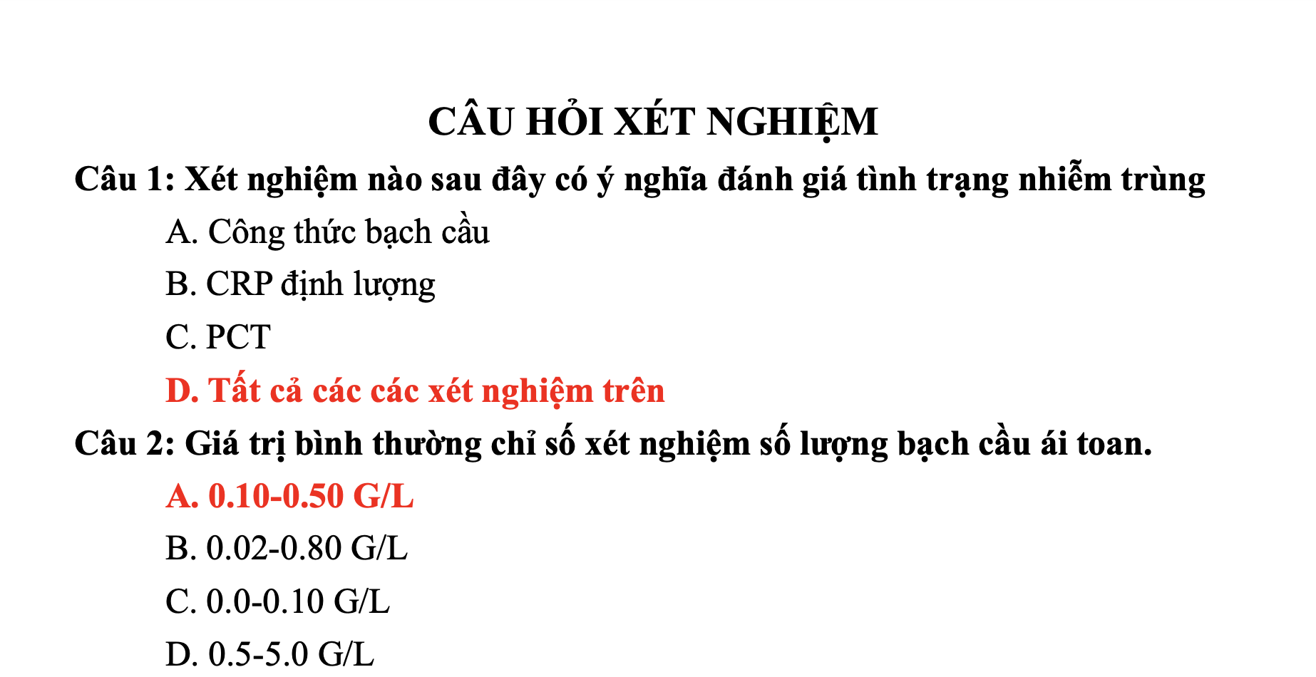 92 câu hỏi được phân theo các nhóm kiến thức xét nghiệm tổng quát và chuyên sâu: