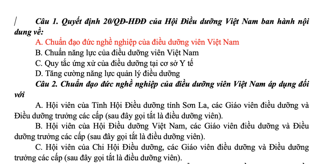 Tài liệu “Câu hỏi Chuẩn đạo đức nghề nghiệp Điều dưỡng viên Việt Nam” là nguồn ôn tập chuẩn hóa giúp điều dưỡng viên củng cố nhận thức đạo đức, xây dựng hình ảnh người điều dưỡng Việt Nam “Tận tâm – Trách nhiệm – Chính trực – Chuẩn mực”, góp phần nâng cao chất lượng chăm sóc và uy tín nghề nghiệp trong hệ thống y tế hiện đại.
