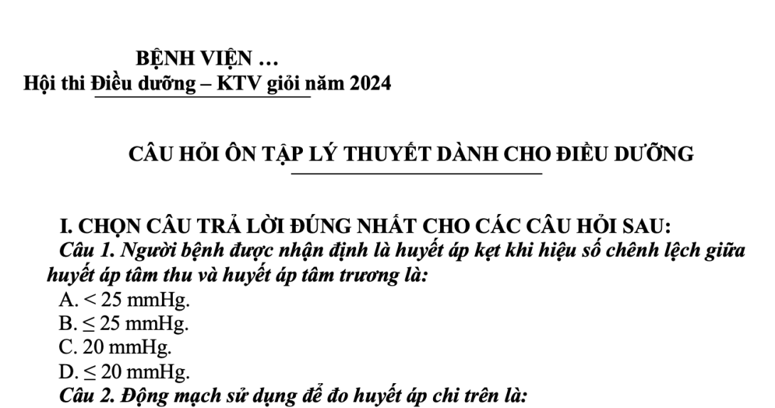 Tài liệu “Câu hỏi lý thuyết điều dưỡng 2024” là nguồn ôn tập toàn diện và chuẩn hóa cho đội ngũ điều dưỡng, hộ sinh, kỹ thuật viên y.
