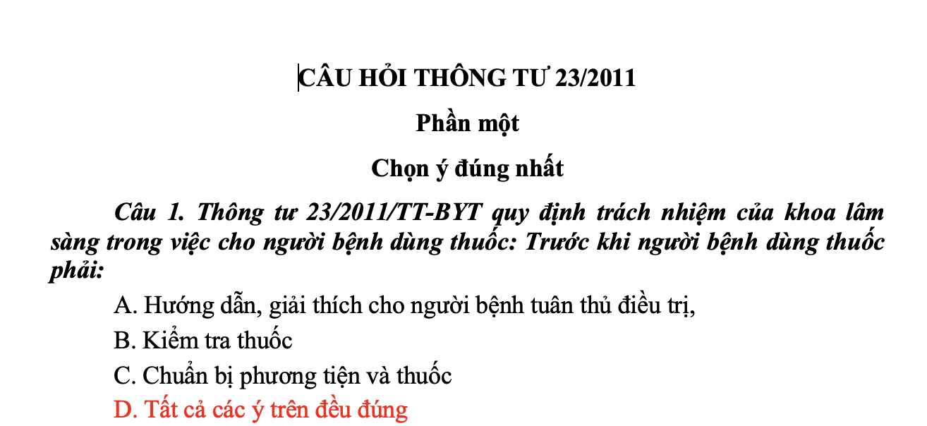 Tài liệu “Câu hỏi Thông tư 23/2011/TT-BYT” là nguồn ôn tập trọng tâm giúp điều dưỡng viên nắm chắc quy định pháp lý, đảm bảo an toàn thuốc trong chăm sóc người bệnh.