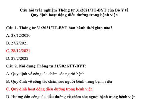 Tài liệu “Câu hỏi trắc nghiệm Thông tư 31/2021/TT-BYT” được biên soạn nhằm hỗ trợ đào tạo, ôn tập và kiểm tra kiến thức cho đội ngũ điều dưỡng, hộ sinh, kỹ thuật viên và quản lý điều dưỡng tại bệnh viện.