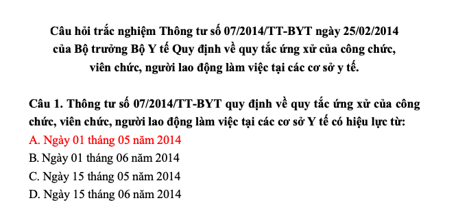 Tên tài liệu: Câu hỏi trắc nghiệm Thông tư số 07/2014/TT-BYT ngày 25/02/2014 của Bộ trưởng Bộ Y tế
