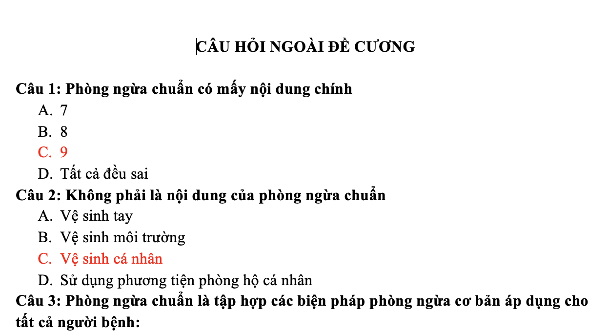 Tài liệu “Câu hỏi và đáp án ngoài đề cương” được biên soạn phục vụ kỳ thi Điều dưỡng giỏi năm 2023, nhằm giúp thí sinh ôn luyện và nắm vững các kiến thức bổ sung ngoài phần đề cương chính thức. Đây là bộ câu hỏi thực tế, cập nhật theo các quy định hiện hành của Bộ Y tế về kiểm soát nhiễm khuẩn, vệ sinh tay, xử lý dụng cụ, quản lý chất thải y tế và an toàn người bệnh.
