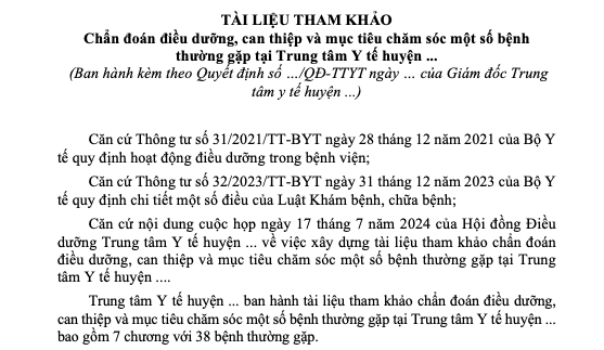 Tài liệu này được Trung tâm Y tế huyện … xây dựng và ban hành theo Thông tư số 31/2021/TT-BYT (quy định hoạt động điều dưỡng trong bệnh viện) và Thông tư số 32/2023/TT-BYT (quy định chi tiết một số điều của Luật Khám bệnh, chữa bệnh).