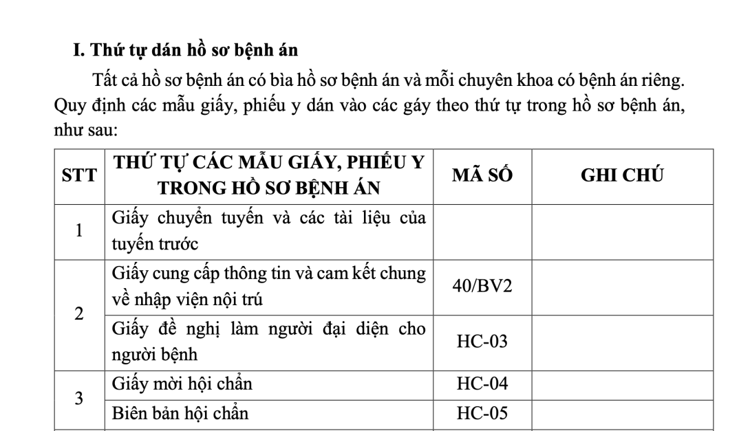 Phần I – Thứ tự dán hồ sơ bệnh án