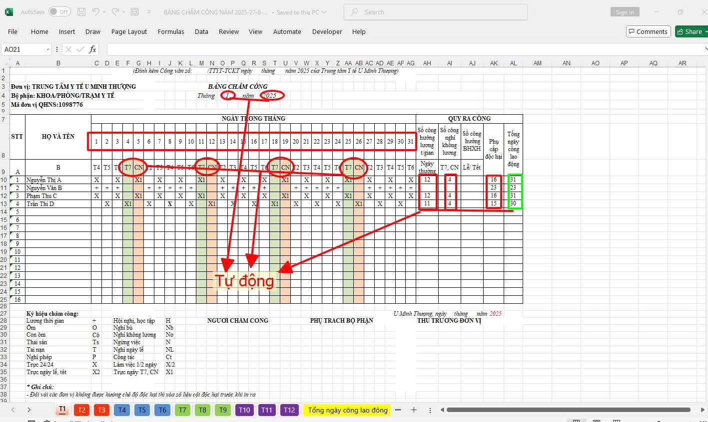 Bảng chấm công theo tháng của từng khoa/phòng được thiết kế trên Excel với cấu trúc thống nhất, dữ liệu được nhập riêng theo từng đơn vị. Toàn bộ các bảng này được liên kết vào một file tổng hợp trung tâm. Hệ thống tự động lấy dữ liệu từ các sheet của khoa/phòng để tổng hợp thành báo cáo chung theo ngày, theo tháng, theo loại công hoặc theo từng nhóm nhân viên.