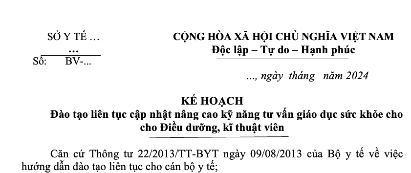 Tài liệu là Kế hoạch đào tạo liên tục của Bệnh viện Phục hồi chức năng tỉnh … năm 2024, nhằm nâng cao năng lực tư vấn – truyền thông – giáo dục sức khỏe và kỹ năng giao tiếp cho đội ngũ Điều dưỡng và Kỹ thuật viên. Kế hoạch được xây dựng dựa trên các Thông tư, Quyết định, và Kế hoạch đào tạo của bệnh viện theo đúng quy định của Bộ Y tế.
