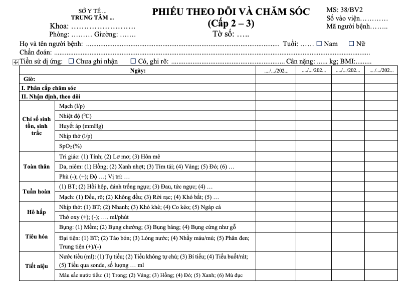 Tài liệu “Phiếu theo dõi và chăm sóc (Cấp 2 – 3)” được xây dựng nhằm hỗ trợ nhân viên điều dưỡng trong việc ghi chép, theo dõi và đánh giá toàn diện tình trạng người bệnh thuộc nhóm chăm sóc cấp 2–3. Phiếu bao gồm các mục nhận định, theo dõi dấu hiệu sinh tồn, tình trạng toàn thân, các hệ cơ quan, can thiệp điều dưỡng, tư vấn giáo dục sức khỏe và bàn giao ca.