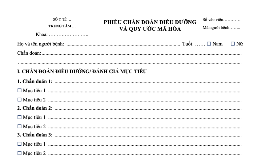 Tài liệu “Phiếu chẩn đoán điều dưỡng và quy ước mã hóa” được xây dựng nhằm hỗ trợ nhân viên điều dưỡng trong việc ghi nhận, xác định chẩn đoán điều dưỡng, mục tiêu chăm sóc, cũng như thống nhất quy ước mã hóa các hoạt động chăm sóc, can thiệp và tư vấn giáo dục sức khỏe. Việc áp dụng mã hóa giúp chuẩn hóa hồ sơ chăm sóc, nâng cao tính hệ thống và hiệu quả quản lý dữ liệu điều dưỡng trong bệnh viện.