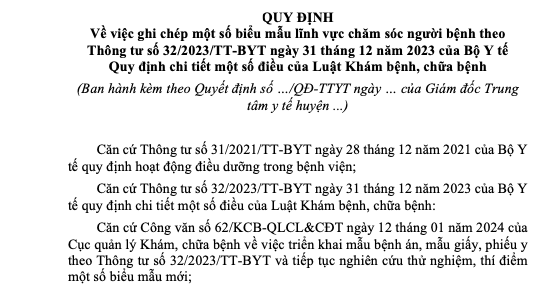 Tài liệu được Trung tâm Y tế huyện … ban hành nhằm hướng dẫn thống nhất việc ghi chép các biểu mẫu điều dưỡng trong hồ sơ bệnh án, căn cứ theo: