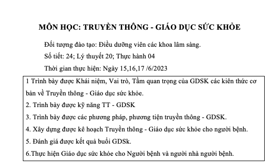 Nội dung được xây dựng theo chương trình bài bản, gồm 5 bài học lớn và phần thực hành, giúp điều dưỡng có khả năng tự xây dựng kế hoạch, triển khai và đánh giá một buổi GDSK cho người bệnh và thân nhân.