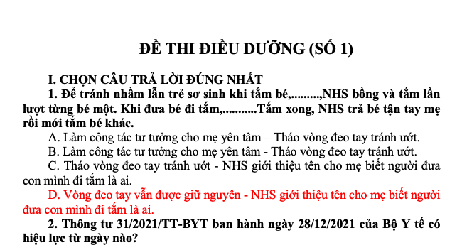Cấu trúc: Gồm 35 câu trắc nghiệm lựa chọn đáp án đúng nhất và 15 câu hỏi đúng/sai, bao phủ toàn diện kiến thức điều dưỡng, sản – nhi, nội – ngoại khoa, kiểm soát nhiễm khuẩn và pháp lý y tế.