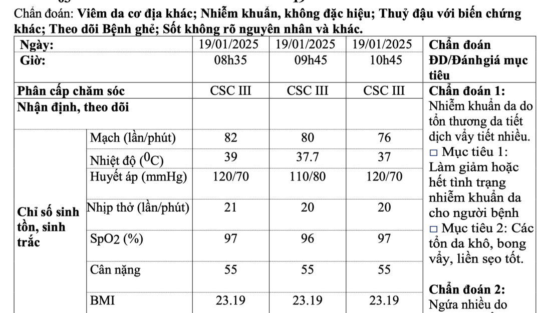 Nhận định và theo dõi người bệnh: Ghi chép đầy đủ các chỉ số sinh tồn (mạch, nhiệt độ, huyết áp, nhịp thở, SpO₂, BMI…) và tình trạng toàn thân, hô hấp, tuần hoàn, dinh dưỡng, giấc ngủ, tinh thần.